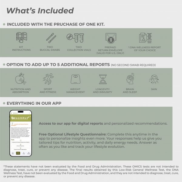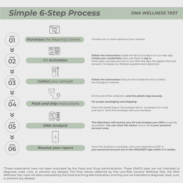 The DNA Wellness Test identifies key biochemical pathways. It uncovers your unique susceptibilities and needs through a simple genomics test. This test provides the basis for MAGISNAT’s tailored approach. By combining omics sciences with precisely formulated dietary supplements, we address the areas where you may be more vulnerable or could benefit from extra support.