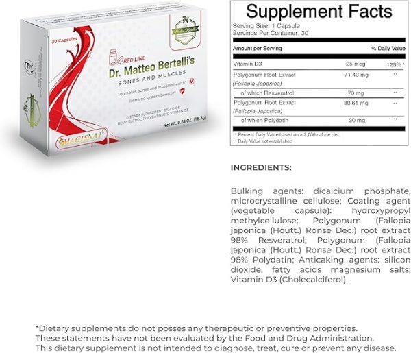 Elevate your wellness with Dr. Matteo Bertelli’s Bones & Muscles, a premium dietary supplement expertly formulated to boost bone strength, muscle function, and cardiovascular health. Harnessing the synergistic power of Vitamin D3, Resveratrol, and Polydatin, this advanced formula promotes superior nutrient absorption and holistic body support.*