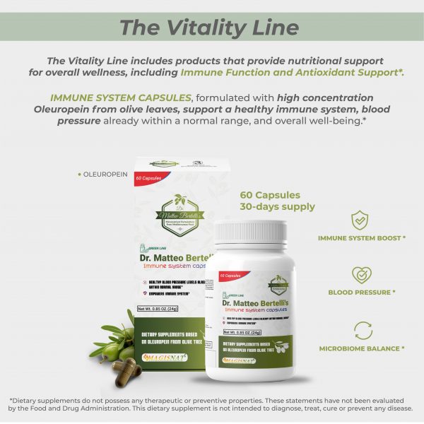 Dr. Matteo Bertelli’s™ Immune System Capsules is a premium dietary supplement designed to support cardiovascular health, immune function, and overall well-being. Formulated with a potent dose of Oleuropein, a powerful polyphenol from the olive tree, this supplement helps maintain healthy blood pressure levels already within the normal range while boosting your immune system and promoting gut health.