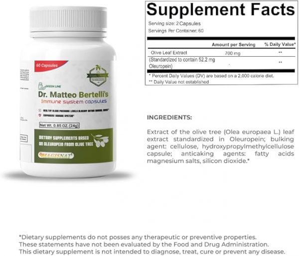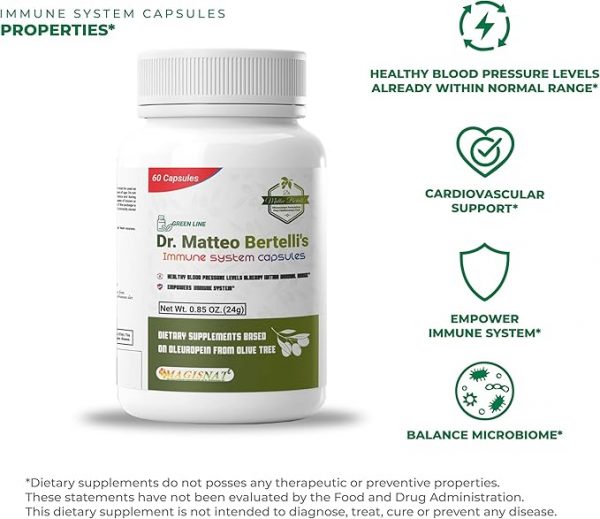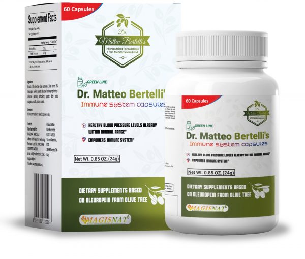Dr. Matteo Bertelli’s Immune System Capsules is a premium dietary supplement designed to support cardiovascular health, immune function, and overall well-being. Formulated with a potent dose of Oleuropein, a powerful polyphenol from the olive tree, this supplement helps maintain healthy blood pressure levels already within the normal range while boosting your immune system and promoting gut health.*