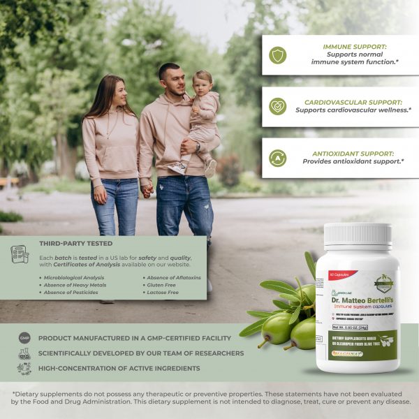 Dr. Matteo Bertelli’s™ Immune System Capsules is a dietary supplement formulated with Oleuropein, a naturally occurring polyphenol found in olives. This formulation provides compounds associated with normal immune system function and overall wellness.