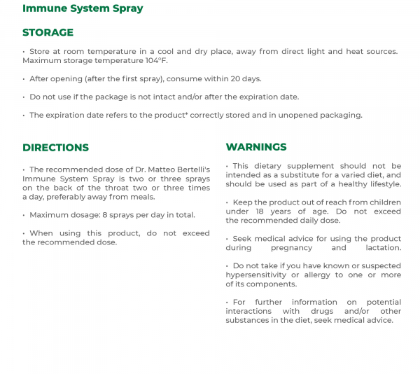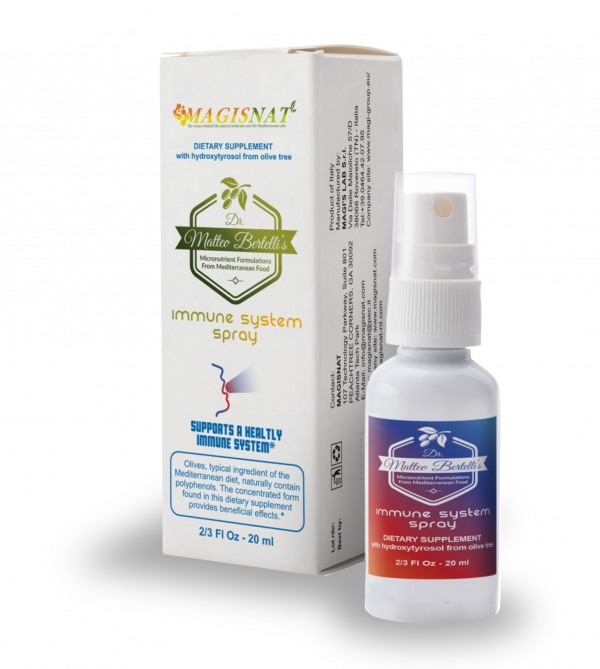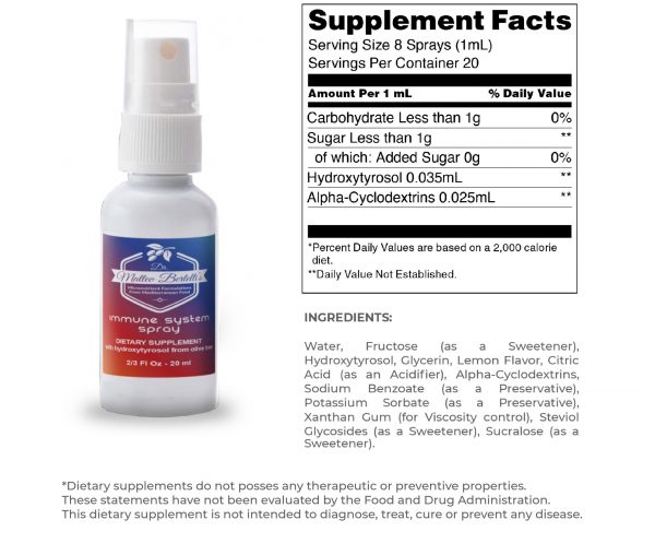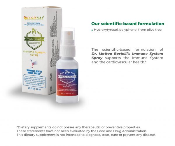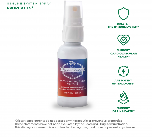 Dr. Matteo Bertelli’s Immune System Spray is a dietary supplement formulated to offer multifaceted benefits. Hydroxytyrosol is a immune booster which fortifies the body’s defenses. It promotes optimal heart function and helps maintain healthy blood pressure levels. As a potent antioxidant, Hydroxytyrosol protects cells from oxidative damage. Additionally, it aids nervous system correct function. The synergistic effects of the selected ingredient support a healthy lifestyle.*