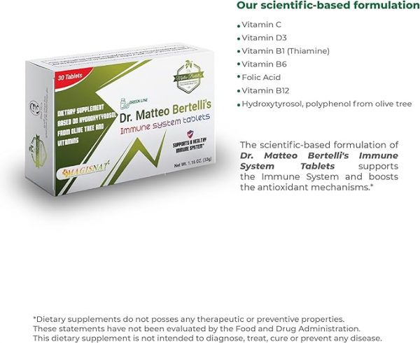 Dr. Matteo Bertelli’s Immune System Tablets is a powerful dietary supplement designed to support overall health and well-being. Formulated with a blend of Hydroxytyrosol, Vitamin C, Vitamin D3, and essential B Vitamins, this daily tablet strengthens the immune system, boosts antioxidant defenses, and promotes cardiovascular and cognitive health.*