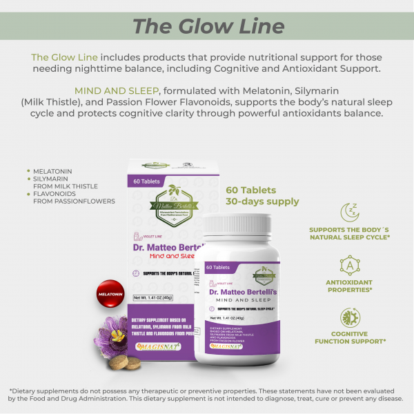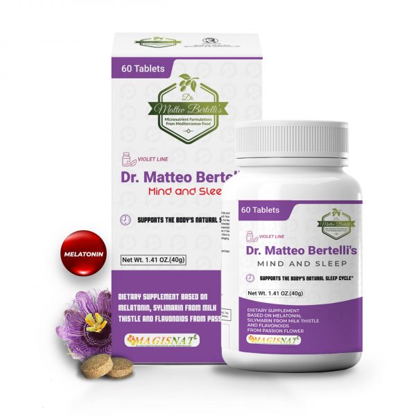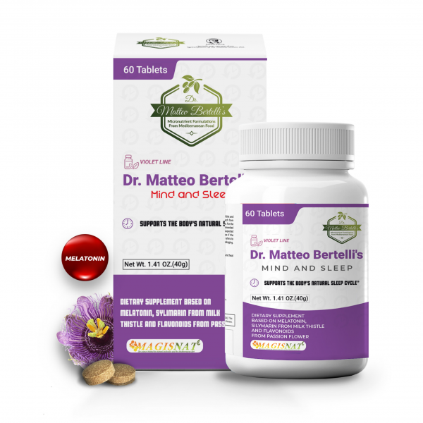 Dr. Matteo Bertelli’s™ Mind and Sleep is a dietary supplement formulated with Melatonin, Silymarin from Milk Thistle, and flavonoids from Passionflower. These ingredients are associated with normal sleep patterns and general wellness.