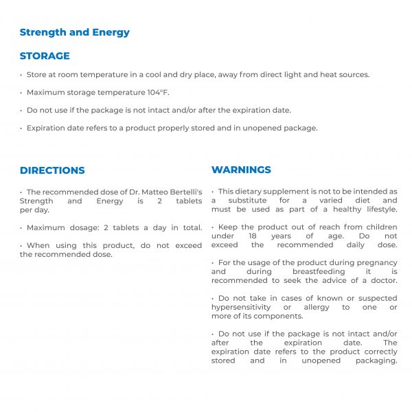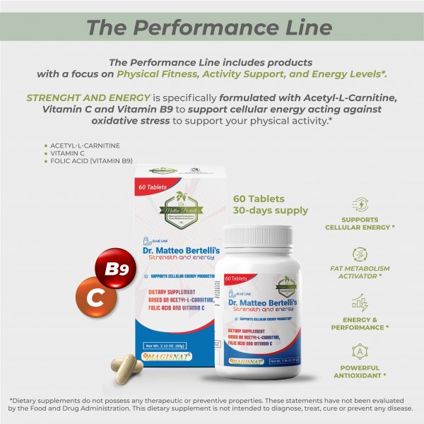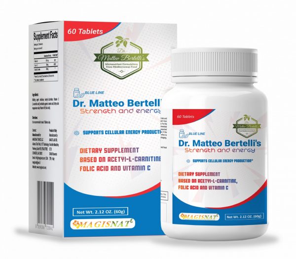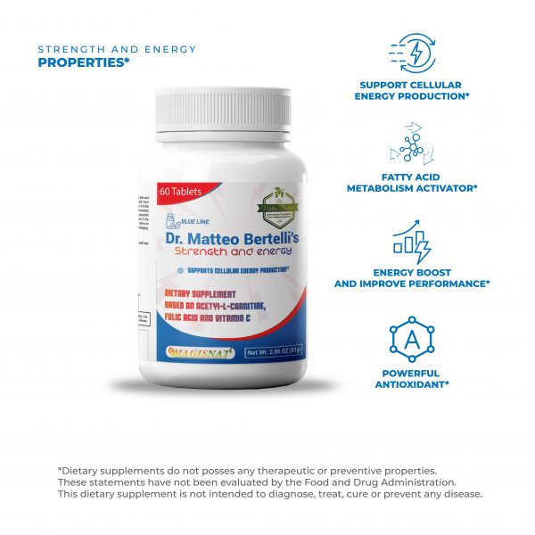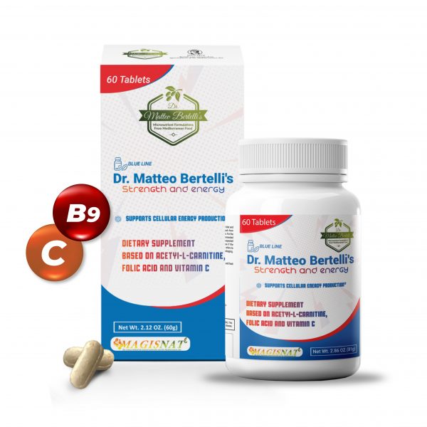 Dr. Matteo Bertelli’s Strength and Energy is a dietary supplement formulated to revitalize the body’s energy level. Acetyl-L-Carnitine supports cellular energy production, aiding in the conversion of fats into energy and promoting metabolic function. Folic Acid complements this process by activating fatty acid metabolism, ensuring efficient energy utilization throughout the body. Vitamin C combats oxidative stress, protecting cells from damage. The synergistic effects of the selected ingredients support a healthy lifestyle. *